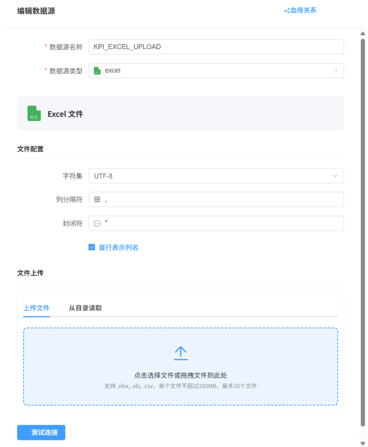 文件上传:Excel/CSV文件拖拽即上传,自动识别表头和数据类型
