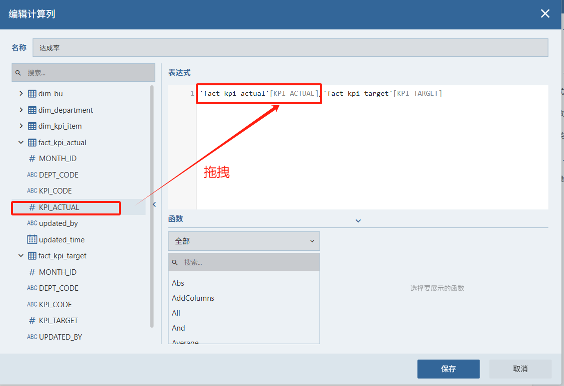 生成衍生字段(列):想要分析“达成率”?无需记忆复杂公式。只需点击“添加计算列”,从函数列表中选择、从字段中拖拽,即可像搭公式一样,快速创建新的业务指标。所有聚合、计算均由平台在后台自动完成。
