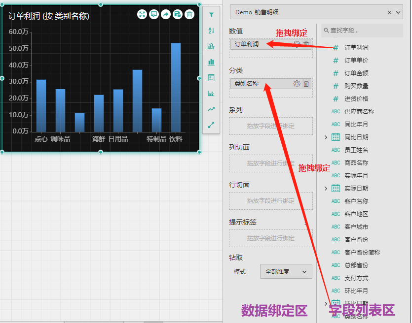 拖拽式分析:在仪表板画布中,将字段拖拽到行/列区域即可。且如imobile BI拥有“智能分析”功能会对字段进行智能推荐并生成合适的可视化效果,更是简化了这一过程。