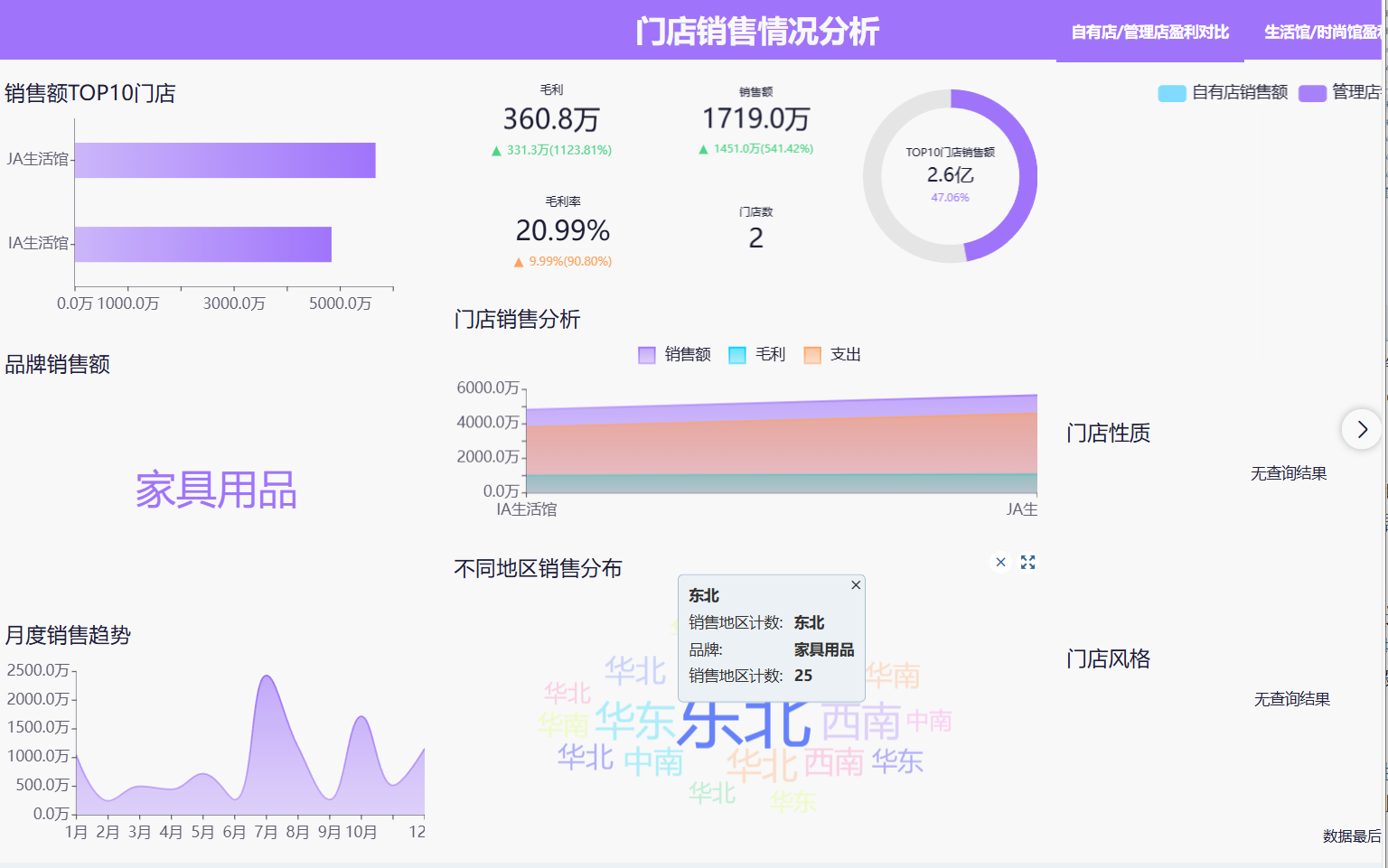 智能筛选与分组:通过点选方式实现联动和下钻功能,即可轻松过滤出特定时间、区域或品类的数据。例如,点击地图上的“东北”区域,其他图表会自动筛选出只与华东相关的数据。这使得高层管理者在一个屏幕上就能纵览全局,并能深入细节探究。