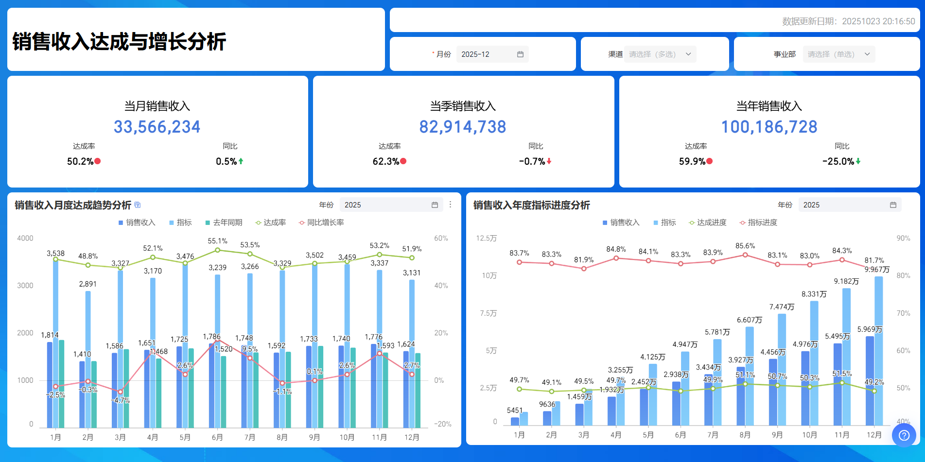 看达成:监控周度/月度销售指标达成率与年度指标完成率,判断是否达标。