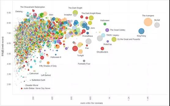首先来点干货,本文根据imdb评分(imdb:互联网电影数据库,是一个关于电影演员、电影、电视节目、电视艺人、电子游戏和电影制作小组的在线数据库。),影评量和票房三个指标做成了100年电影史的气泡图,横轴为影评量,纵轴为imdb评分,气泡大小为票房。