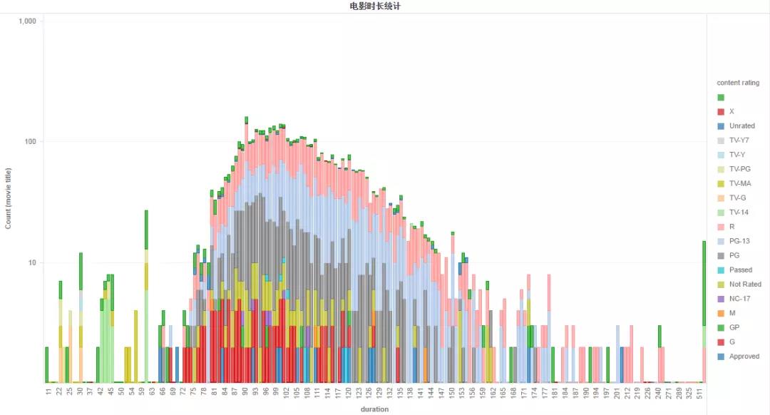 上图是电影时长的数量统计的条形图。根据数据显示,近百年来,大多数的电影时长都被控制在80分钟到135分钟左右,其中以90分钟到100分钟最为集中。