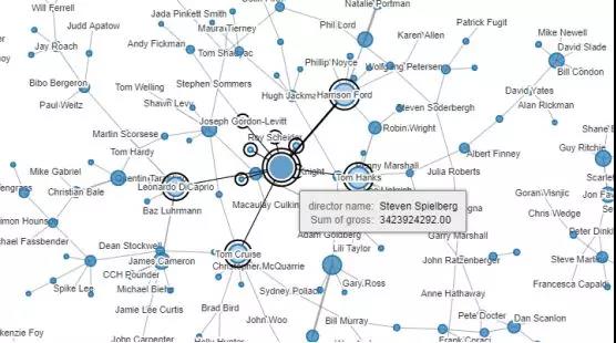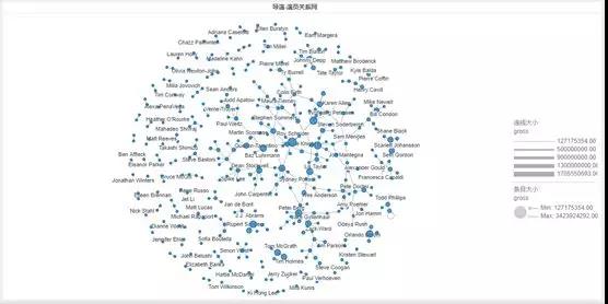最后,来看看演员和导演的合作关系。上面这张关系图代表相互关联的导演和演员,其中节点的大小由取得的票房来决定,放大来查看其中票房最大的一组关系。