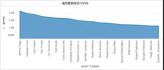 接着分析票房和平均影评排名前20位的演员,票房排名前三甲为Johnny Depp(加勒比海盗,爱丽丝梦游仙境) Harrison Ford(星球大战,印第安纳琼斯)以及 Tom Hanks(玩具总动员,阿甘正传)。
