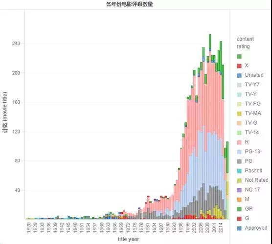 从上面的条形图中我们可以发现,电影行业近几年飞速发展,电影产出数量直线上升,而根据电影评级来分析,近些年大部分的电影属于R级(限制级,17岁以下的孩子需要父母或成年监护人的陪同)、PG-13级(13岁以下特别辅导级,强烈告诫父母,有些内容可能不适合13岁以下孩子观看)和PG级(家长辅导级,有些内容可能少儿不宜)。