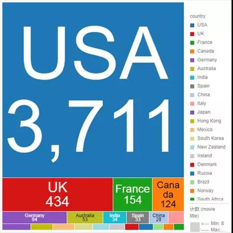 以上的热图中,面积大小代表每个国家的电影数量。由此看出本次分析的电影数据中,无疑来自美国的电影占到绝大部分,另外还有些来自英国、法国、加拿大、德国、澳大利亚、印度、西班牙和中国的电影。
