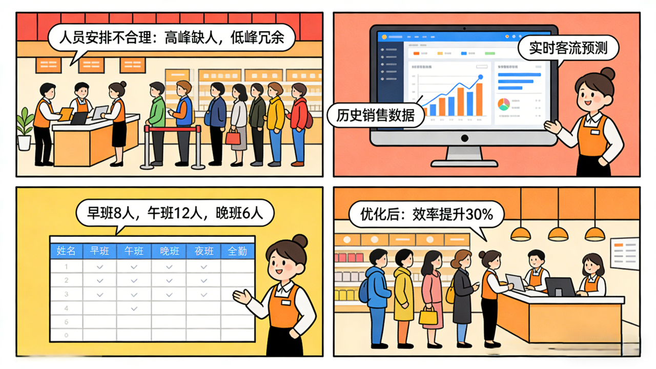 场景:排班固定,高峰期人手不够顾客排队与抱怨,闲时员工扎堆无所事事,人力成本浪费。