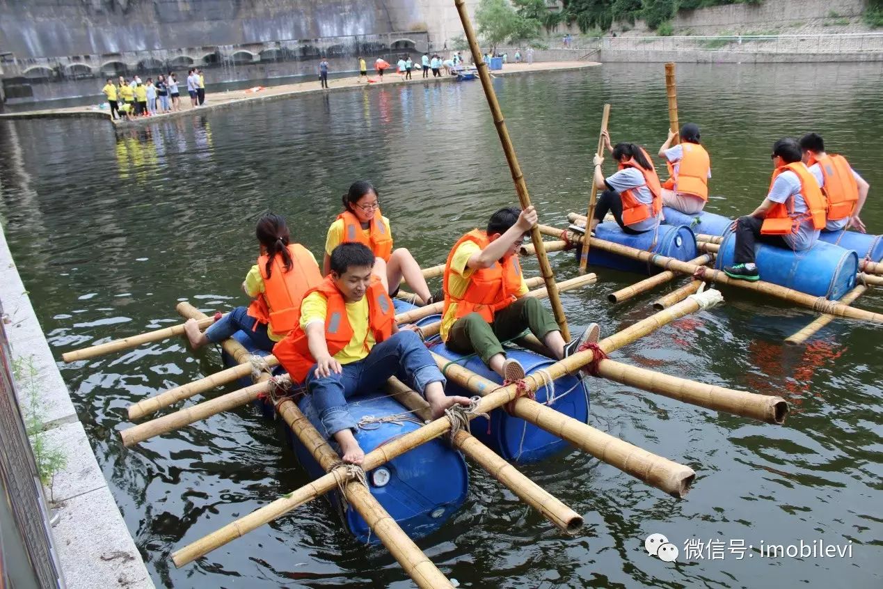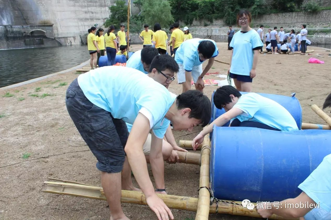 从选木筏、绑绳子,到渡河,各组无不人仰马翻。绳子绑了又松,来回调整位置桶子与木筏的位置,就是为了确保同伴们渡河安全,获得最终胜利。