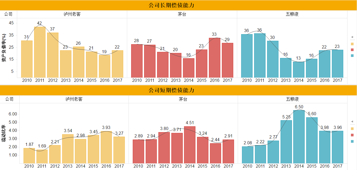 茅台酒的偿债能力基本上稳定,且与行业水平相当,与其他相类似的对标企业也基本持平,在偿债能力上基本上没什么问题。