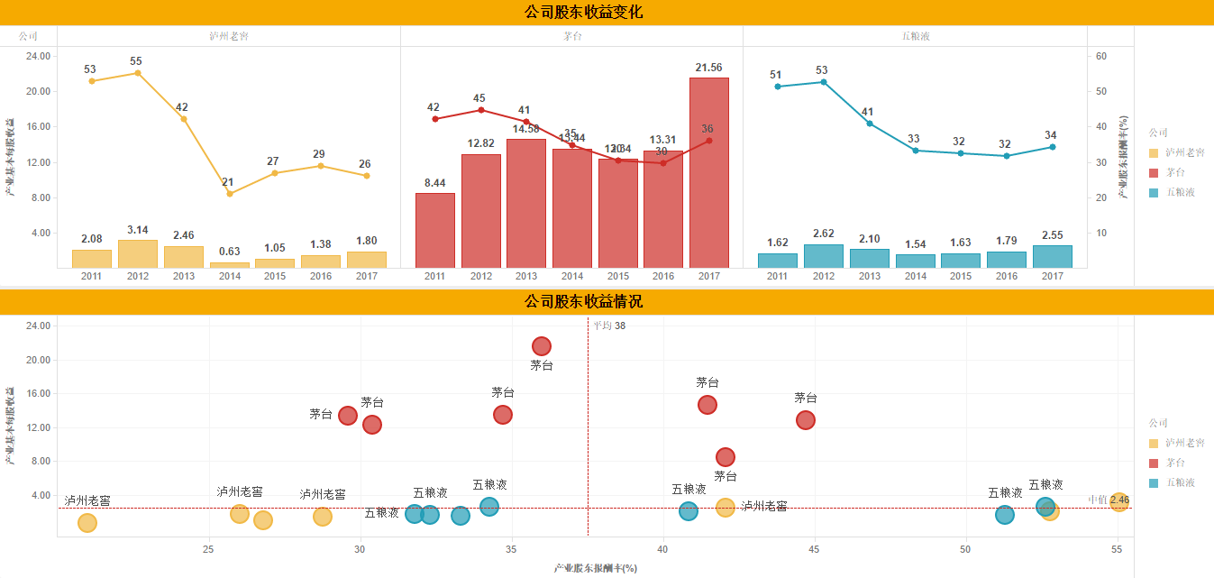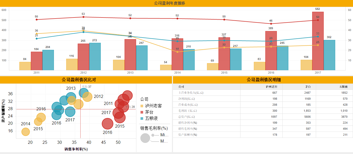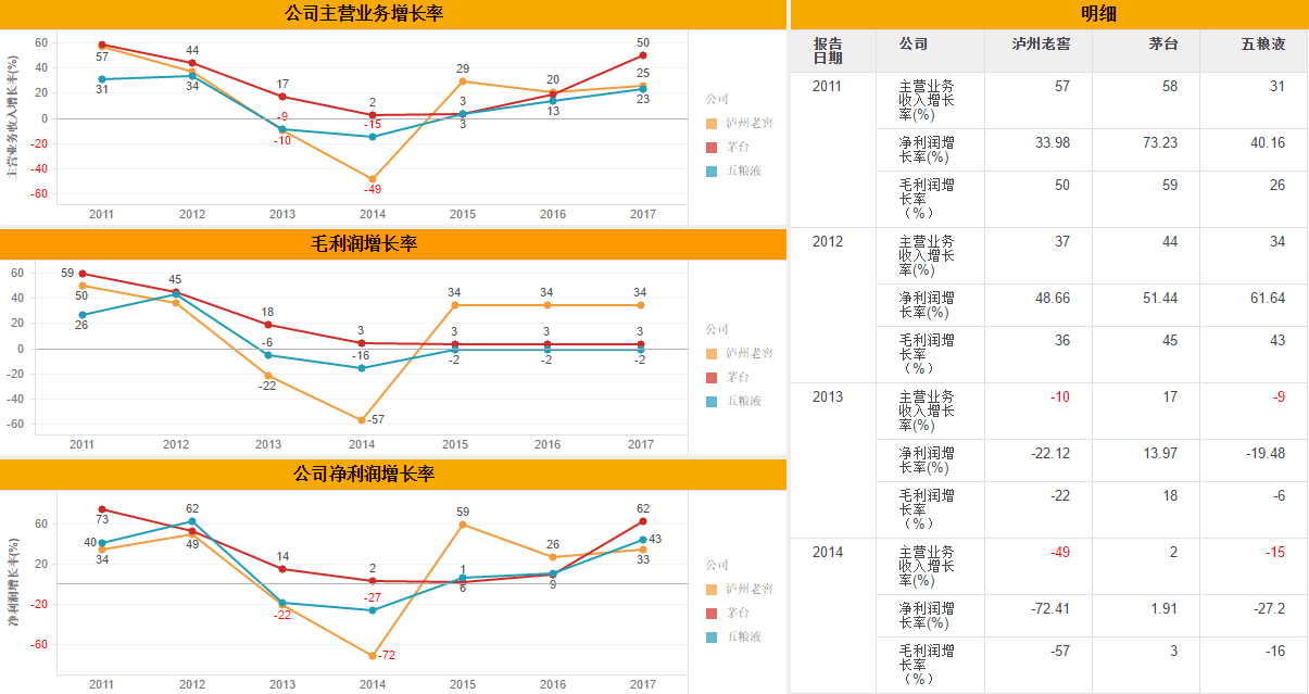 通过观察,五粮液和茅台在2017年盈利激增,同年泸州老窖盈利下降,可以发现在近几年消费升级趋势下,酒行业特别是高端酒和高度酒类业绩在逐步上升,这是一个整体的趋势。