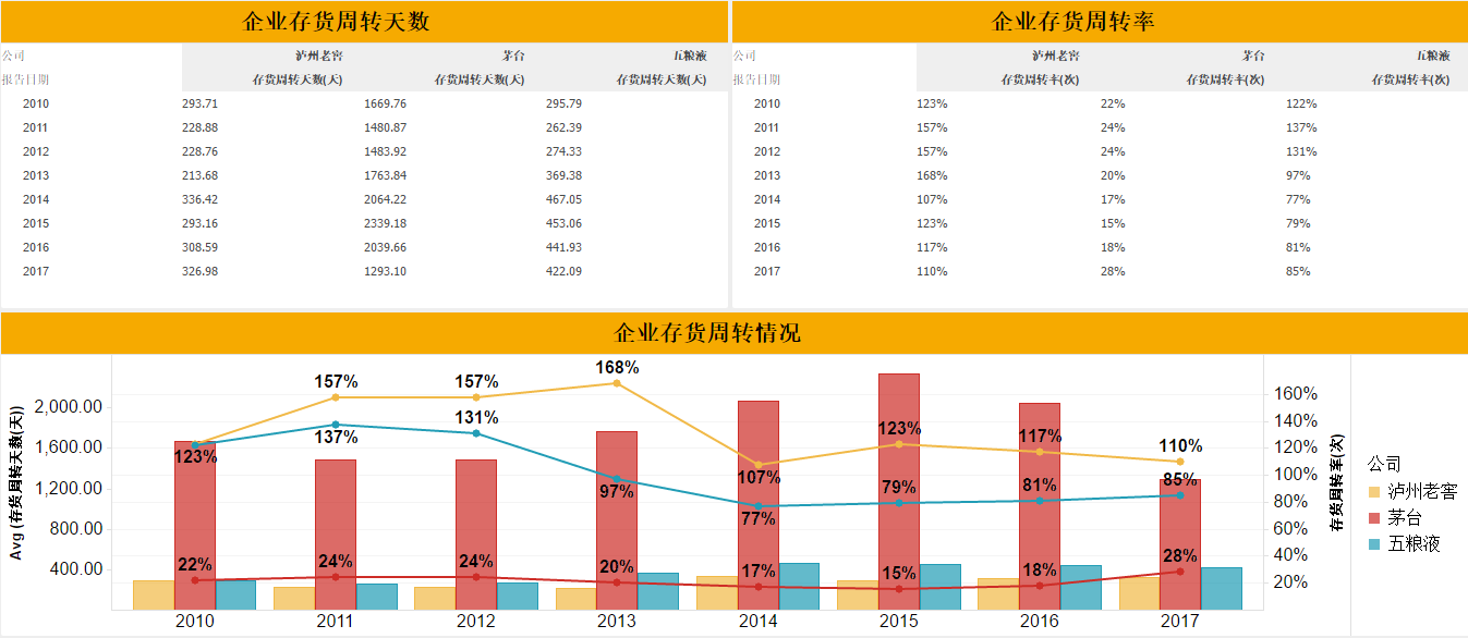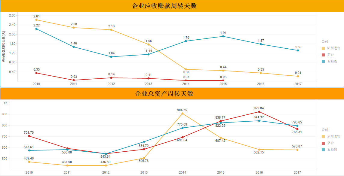 相较而言, 茅台的总资产周转天数在近几年一直居高不下,在存货方面,远远超过同类型五粮液的周转天数,说明其在库存管理方面存在严重问题,这需要茅台进行严格控制。
