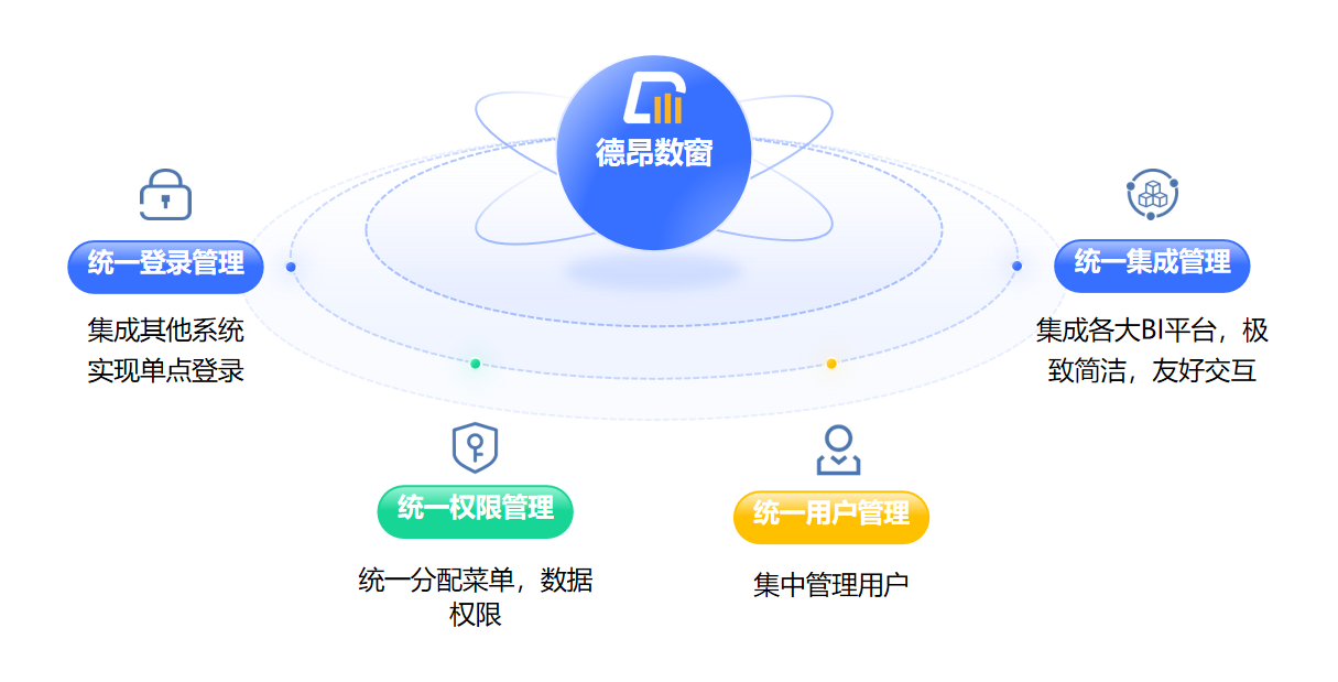 德昂提供DataWindow数窗企业级数据门户产品,可为市面主流BI工具提供集成管理、统一权限管理、账号映射管理、报表访问、报表点赞收藏等,支持企业微信、飞书、钉钉集成和定时信息推送、支持单点登录、支持规则定义引擎等功能模块,拥有自由的用户自定义功能以及丰富的用户交互功能,为业务用户提供友好互动功能,为IT用户提供便捷的管理和监控功能