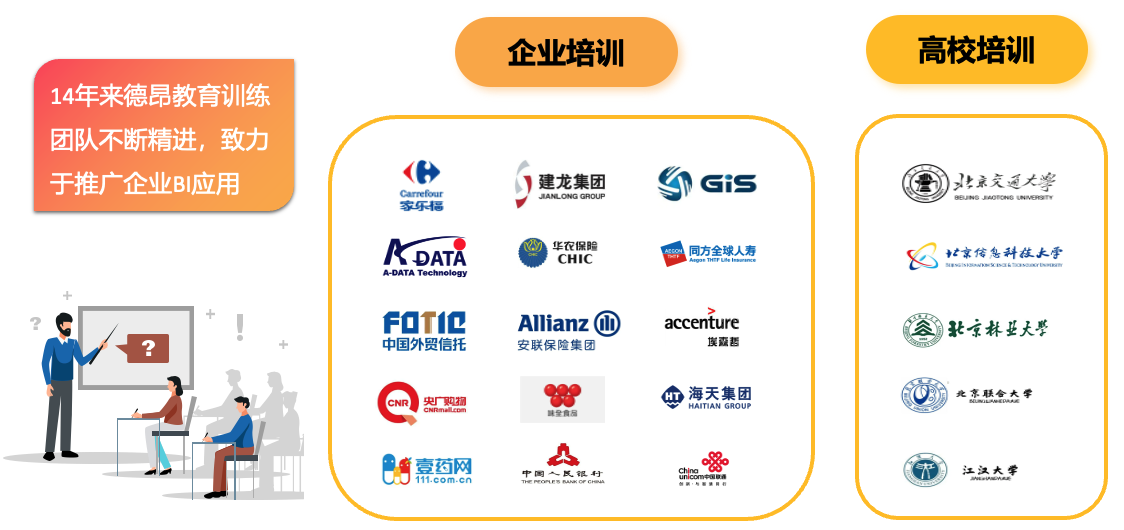 十几年来德昂教育训练团队不断精进,致力于推广企业BI应用,提升高校学生数据分析实战技能,德昂培训过的部分客户如图