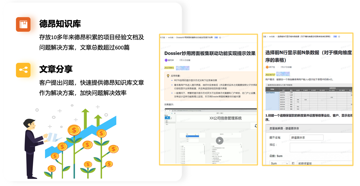 德昂知识库存放10多年来德昂积累的项目经验文档及问题解决方案,客户提出问题,快速提供德昂知识库文章作为解决方案,加快问题解决效率