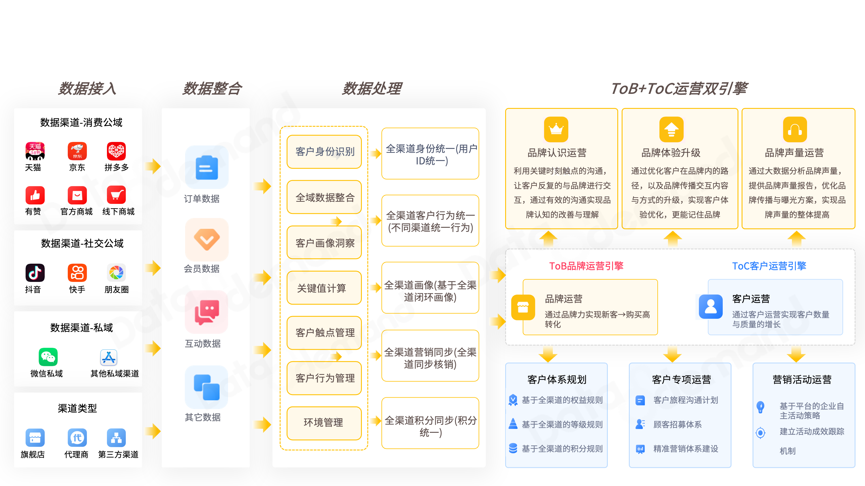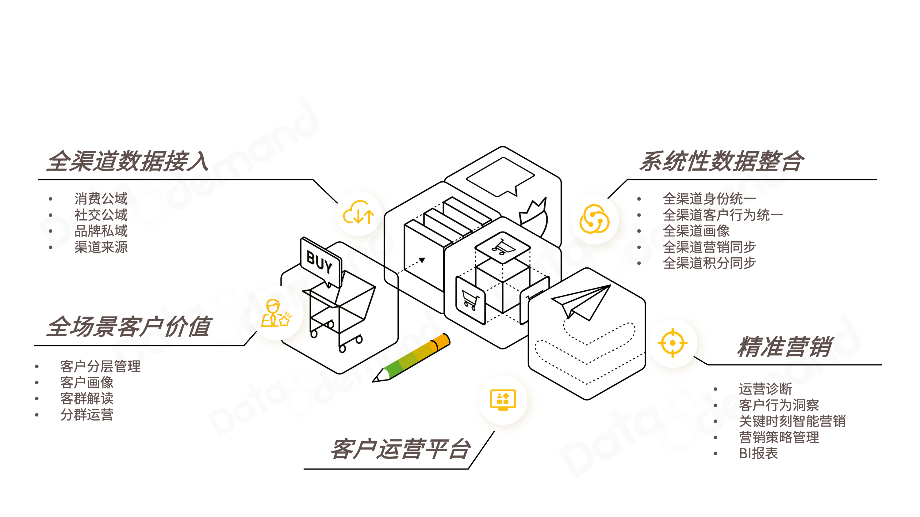 以客户为中心,连接全渠道客户触点并持续互动,沉淀客户数据,通过一体化客户运营平台的底层将数据价值变现